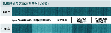 經過14年時間,其他涂層都明顯粉化變色,而使用KYNAR的氟碳涂層絲毫未變。