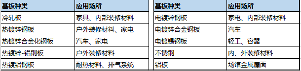 彩基板,即彩涂鋼板用基板,包括冷軋板、熱鍍鋅鋼板、熱鍍鋁鋅鋼板、熱鍍鋁鋼板、電鍍鋅鋼板以及鋁板和不銹鋼板,通常情況,根據涂層鋼板所用場所決定采用的基板種類,一般情況,在腐蝕性較弱的室內環境,采用腐蝕性稍差或一般的冷軋鋼板、電鍍鋅鋼板,而在腐蝕性較強的室外環境,采用較耐蝕的熱鍍鋅或其合金化鋼板作為基板。